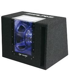 Итак, к вашим услугам результат – достаточно компактный (473 х 380 х 314/414 мм) высокоэффективный корпусной сабвуфер, в котором трудится 12-дюймовая головка серии Type-E. Бандпассовое оформление обеспечивает высокую басовую отдачу даже при работе с усилителями скромной мощности. Дополнительным «бонусом» банпасса является то, что сабвуферная головка абсолютно закрыта, а значит ее диффузор не может быть случайно поврежден предметами в багажнике. Украшением изделия является акриловое окно, в котором отлично видна сабвуферная головка – внутреннее пространство подсвечено синими светодиодами.